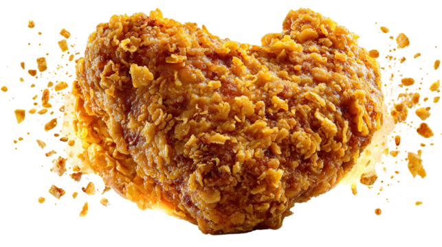 Golden Heart of Crunch: An exquisite piece of fried chicken, shaped like a heart, explodes with golden flakes. A feast for the eyes and a testament to delicious indulgence.