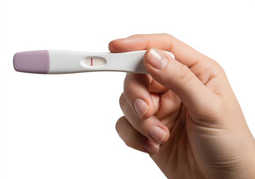Negative pregnancy test held in hand on transparent background, single-use test strip, not pregnant result, fertility awareness