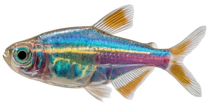 Glowing neon tetra fish, shiny scales and blue-red strip in aquarium theme. Isolated on transparent background