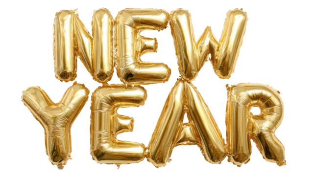 Happy New Year. Happy New Year balloons. New Year celebration. Helium balloon. Golden Yellow foil color. Good for party, greeting card, store advertising, anniversary. Isolated background