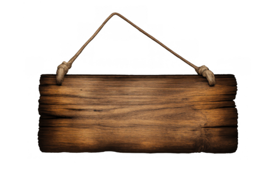 Dark wooden hanging sign with three horizontal planks and yellow rope, isolated on transparent background, rustic and empty for text or decoration, suitable for shop or cafe signage