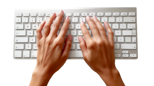 Detailed view of hands typing on a silver keyboard isolated on transparent background PNG
