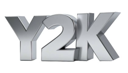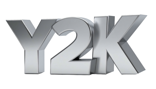 Metallic, stylized "Y2K" text in 3D silver on black background