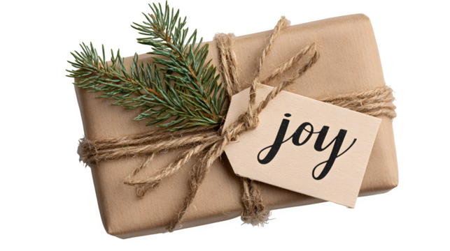 Rustic gift box in brown kraft paper with hand-lettered "Joy" tag, pine sprig, and natural twine bow, isolated on white background