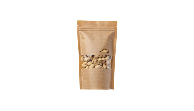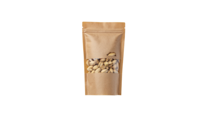 A brown kraft paper bag with printed text and a seal at the top is centered on a plain white surface no background