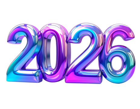 Holographic 3D 2026 Text with Iridescent Gradient and Futuristic Chrome-Glass Style on White Background