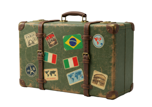 Vintage distressed green leather travel suitcase with ornate brass latches, brown handle, worn global stickers on transparent background, concept of wanderlust and exploration