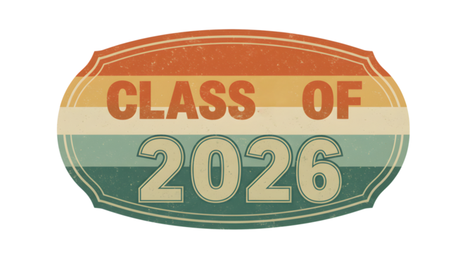 Retro Vintage Class of 2026 Badge with Distressed Text and Colorful Stripes
