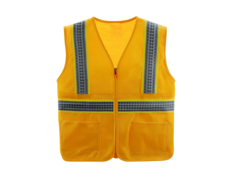 A yellow safety vest high-visibility vest with black stripes and white text on the chest on transparent background