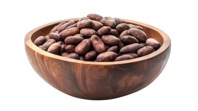 a wooden bowl filled with cocoa beans. showcasing their rich brown color and natural texture  organic nature of the beans. often used in chocolate production and culinary applications it emphasizes th