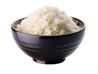 A bowl of freshly steamed white rice in a black bowl, ideal for various culinary presentations. Isolated on transparent background, png.