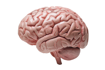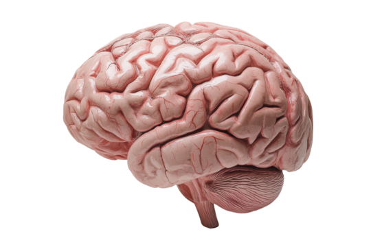Detailed anatomical view of a human brain with realistic texture and color, isolated on a white background.