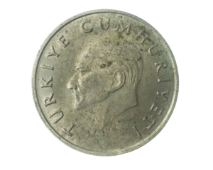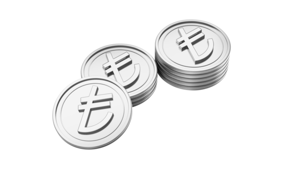Shiny silver Turkish Lira coins stacked and spread on a black background,