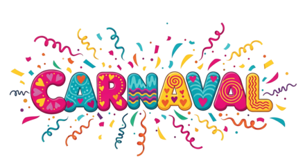 Brazilian Carnival. Word written in Portuguese: Carnaval (Carnival) with flashes of fireworks and colorful confetti. Festive emblem, banner, poster, greeting card and invitation to a Carnival party.