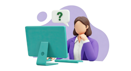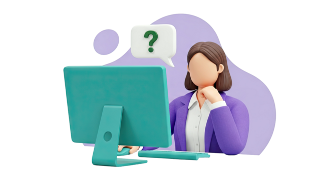 3D Cartoon Woman Pondering at Computer with Question Mark Bubble