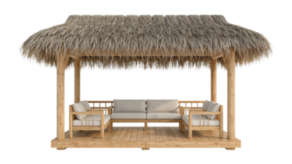 Outdoor patio gazebo with thatched roof and sofa set isolated on transparent background