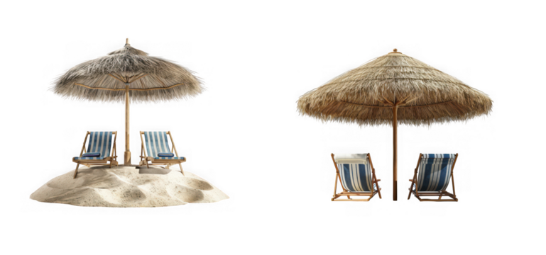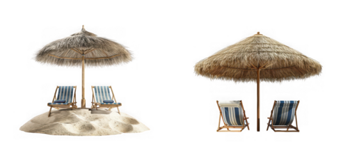 Two idyllic beach scenes with thatched umbrellas deck chairs and sand perfect for summer designs on transparent background
