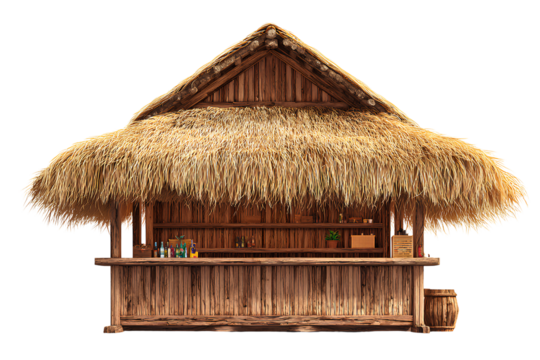Simple wooden tiki bar with a thatched roof, in a transparent background