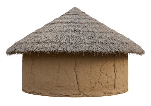 simple African hut with a thatched roof, traditional features and decorations, isolated on a transparent background