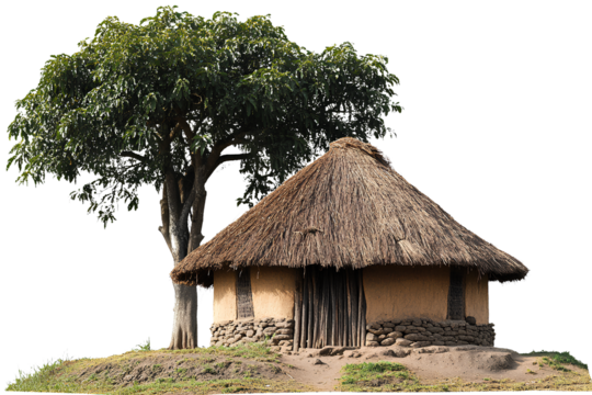 simple African hut with a thatched roof, traditional features and decorations, isolated on a transparent background
