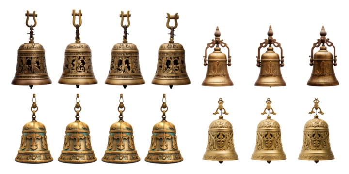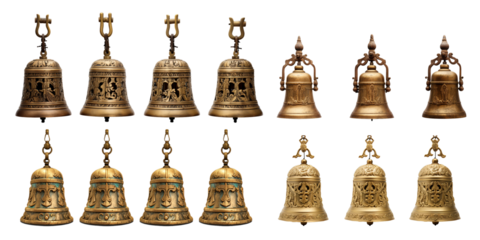 Collection of large temple bell isolated on a white background as transparent PNG