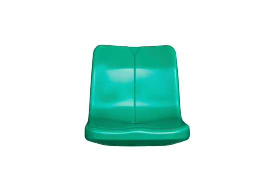 A wide angle view of an empty stadium with running tracks and green field on a bright day with transparent background