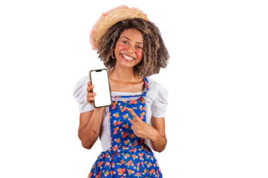 Young black Brazilian woman, with country clothes, dressed for Festa Junina. holding smartphone with white screen for ads, mobile apps.