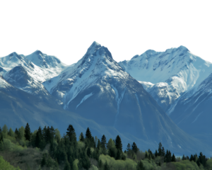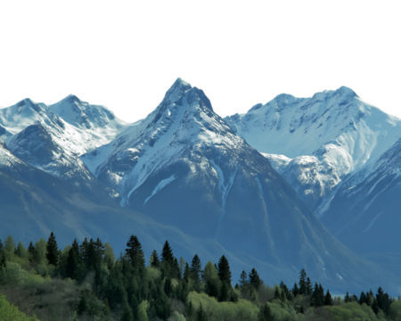 A majestic mountain range with lush pine trees isolated on white background. Suitable for marketing or business purposes. PNG file