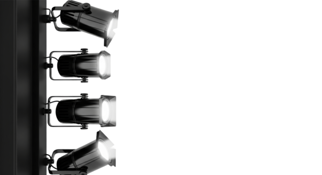 Four studio fresnel lights with barn doors isolated on transparent background, equipment for professional film and video production
