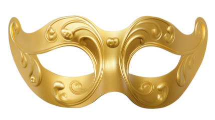 Ornate gold-colored mask with intricate swirls and floral patterns on transparent background