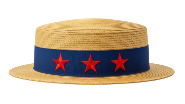 Straw boater hat with red stars isolated PNG, vintage summer headwear for costume party and theatrical productions on transparent background