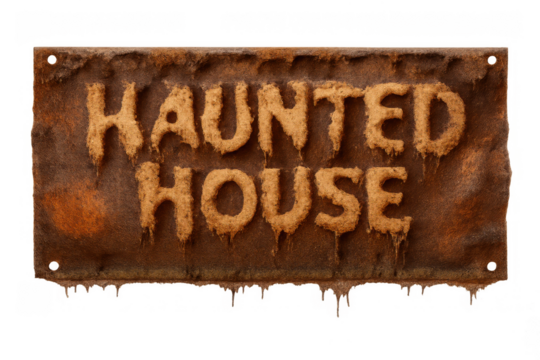 Haunted house sign having creepy dripping letters and rusted metal texture for halloween horror themes