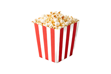 Red and white striped square popcorn container overflowing with fluffy white and golden popped corn, isolated on a transparent background