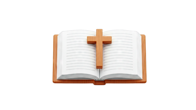 Open Bible with Wooden Cross. Isolated on transparent background.