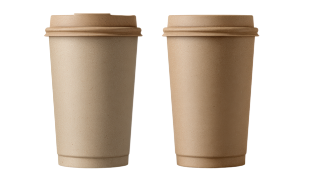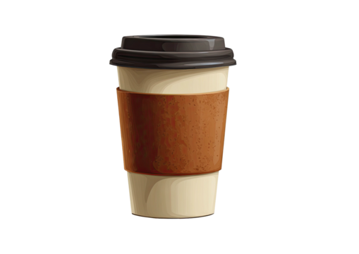 Disposable white paper coffee cup with a brown plastic lid and protective cardboard sleeve isolated on transparent background.