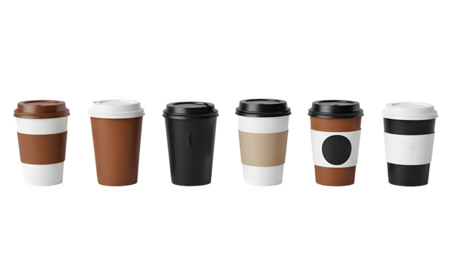 Six travel mugs isolated on transparent background