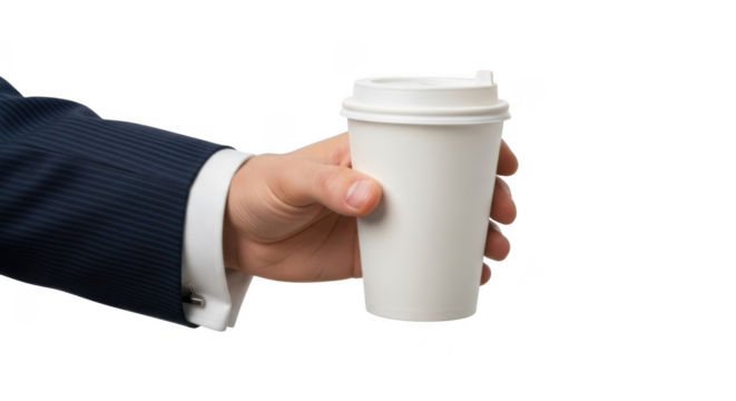 Hand in suit holding white disposable coffee cup with lid on transparent background
