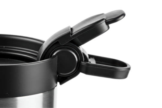 Close-up of an open black flip-top lid on a travel mug on a transparent background