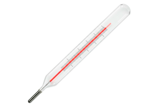 Medical glass thermometer with a red indicator for temperature isolated on a transparent background