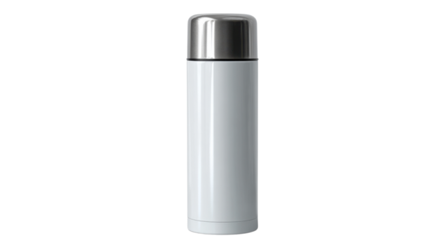 Thermos Bottle in Pristine Detail: A modern thermos bottle, meticulously captured against an understated backdrop, epitomizes a sleek design aesthetic. Showcasing simplicity and functionality.
