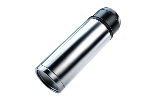 a hand holds a sleek, stainless steel thermos embracing warmth on the go, isolated on transparent background