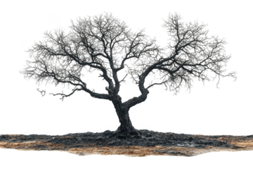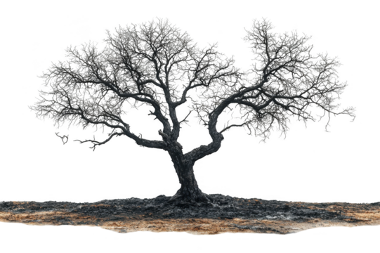 Full view of burned tree with thick branches isolated on a cut out PNG transparent background