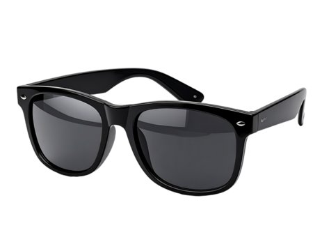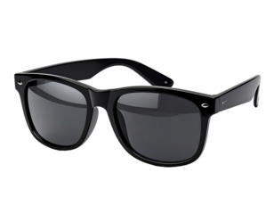 A pair of classic black sunglasses, designed with thick frames and tinted lenses, set against a dark background