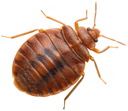 Macro photograph of a reddish-brown bed bug with segmented body and thin legs, captured in sharp focus , showcasing its textured exoskeleton and antennae,, isolated on transparent background.