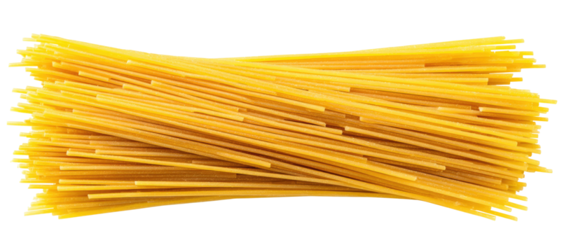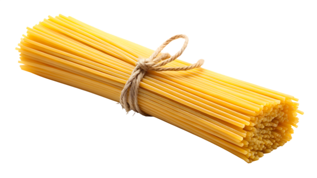 Bundle of uncooked spaghetti pasta tied with twine on a black background food isolated on a transparent background