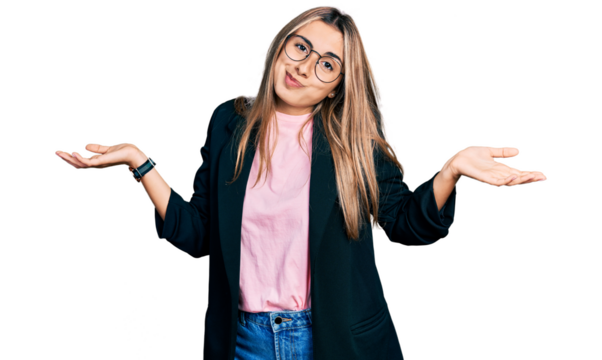 Hispanic young woman wearing business jacket and glasses clueless and confused expression with arms and hands raised. doubt concept.