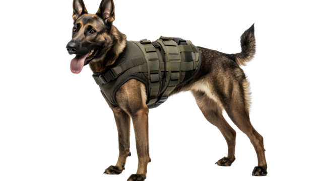 A professional Belgian Malinois police dog wearing a bulletproof vest, trained for K9 law enforcement operations, known for intelligence and agility.
