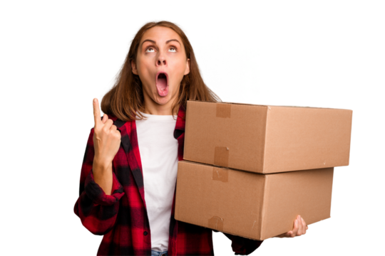 Young caucasian woman moving while picking up a box full of things isolated pointing upside with opened mouth.