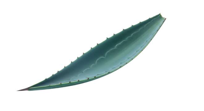 A single, isolated succulent plant leaf, with a sharp, serrated edge and a gentle curve, set against a plain background, showcasing its natural beauty and texture