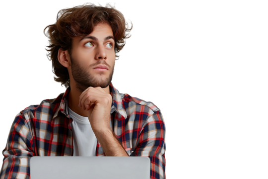 Portrait of man wear stylish shirt thoughtfully hold laptop on transparent background